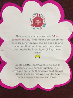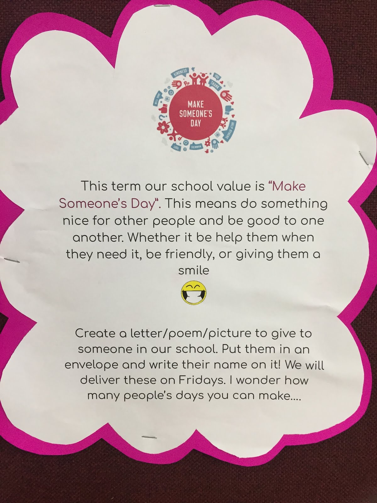 We have been talking about what this means, so far we have studied Empathy, and Caring for others. In our classroom this term we have a letterbox. In here we are posting letters to students/teachers all around the school in order to make their day. Some students from other classes have been coming in in the mornings to write letters too! We think that this is a good way to show our values! On Fridays we have been delivering these around.. keep an eye on the post and maybe it'll be your turn next!