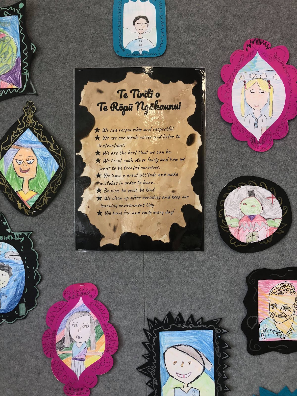 We read the Tree hut treaty and then decided to make our own. In small groups, we brainstormed different ideas about expectations from all different people, such as, ourselves, our parents, our teachers, Mr Wilkinson, and even our cleaners. Miss Johnstone put the some of these ideas together to form our class Treaty. Nalanee and Nazif stained it with tea and coffee because we wanted it to resemble an old document like the Treaty of Waitangi. Miss Johnstone then (carefully) burnt the edges, and her fingers, to give it an old look. We think it looks great and it takes pride of place on our wall! We also created class portraits to put around it and act as our signatures. There were hundreds of people who signed the Treaty of Waitangi.. so we didn't have quite as many!
