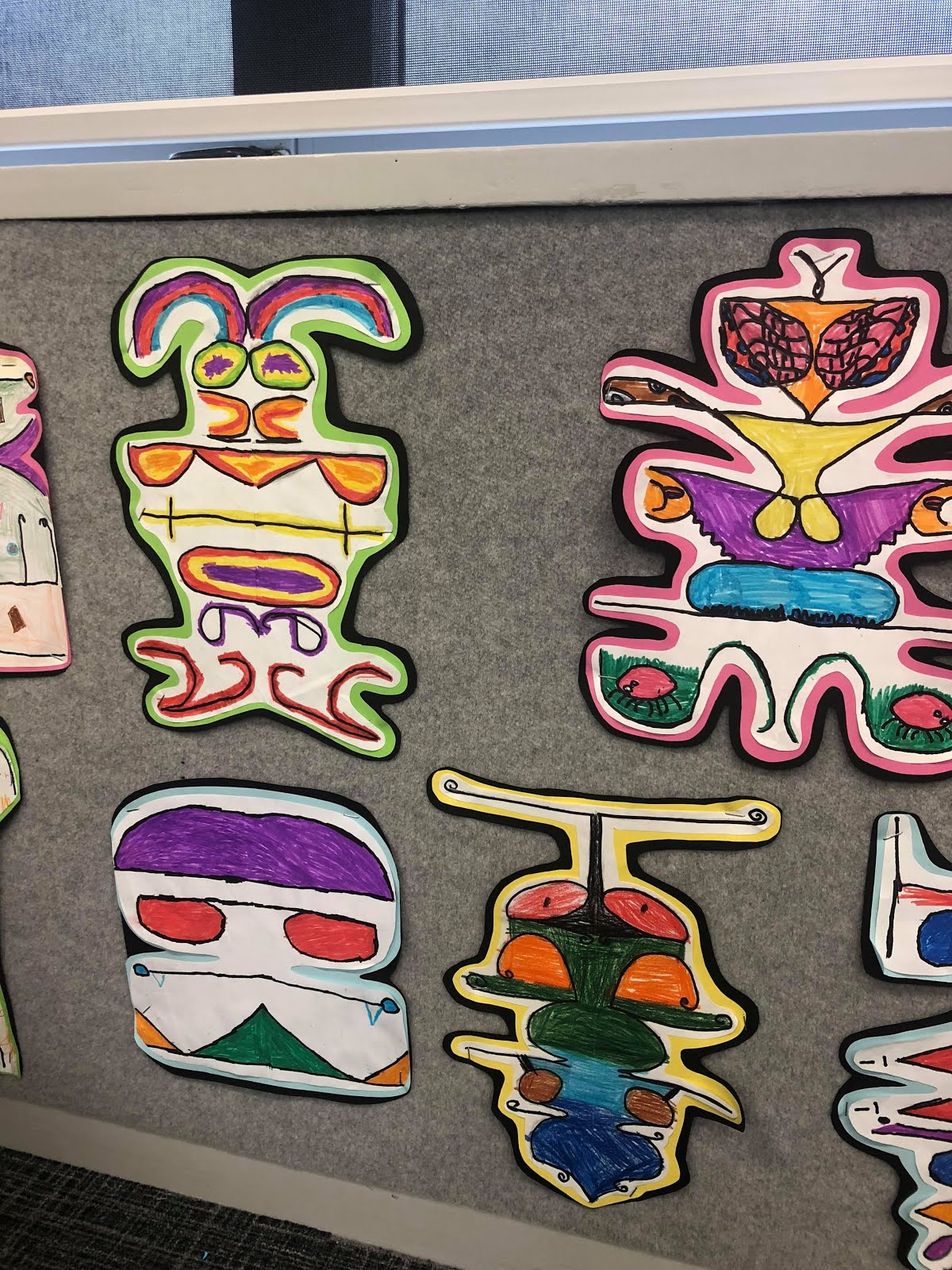 The next task was to create symmetrical name masterpieces! We had to write our name nice and big on one half of a folded piece of paper. We then learnt the rubbing technique and this imprinted our name on the other half. We vivided over our names, and then decorated it and they ended up looking a bit like bugs. We had to use colour to make our names symmetrical and like a mirror image. Check them out below.