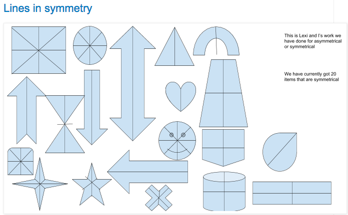 For Numeracy in Ngakaunui we are beginning to look at symmetry. First we looked at some images and had to decide whether or not they were symmetrical or asymmetrical. We then found our own images and made a google drawing to show these.