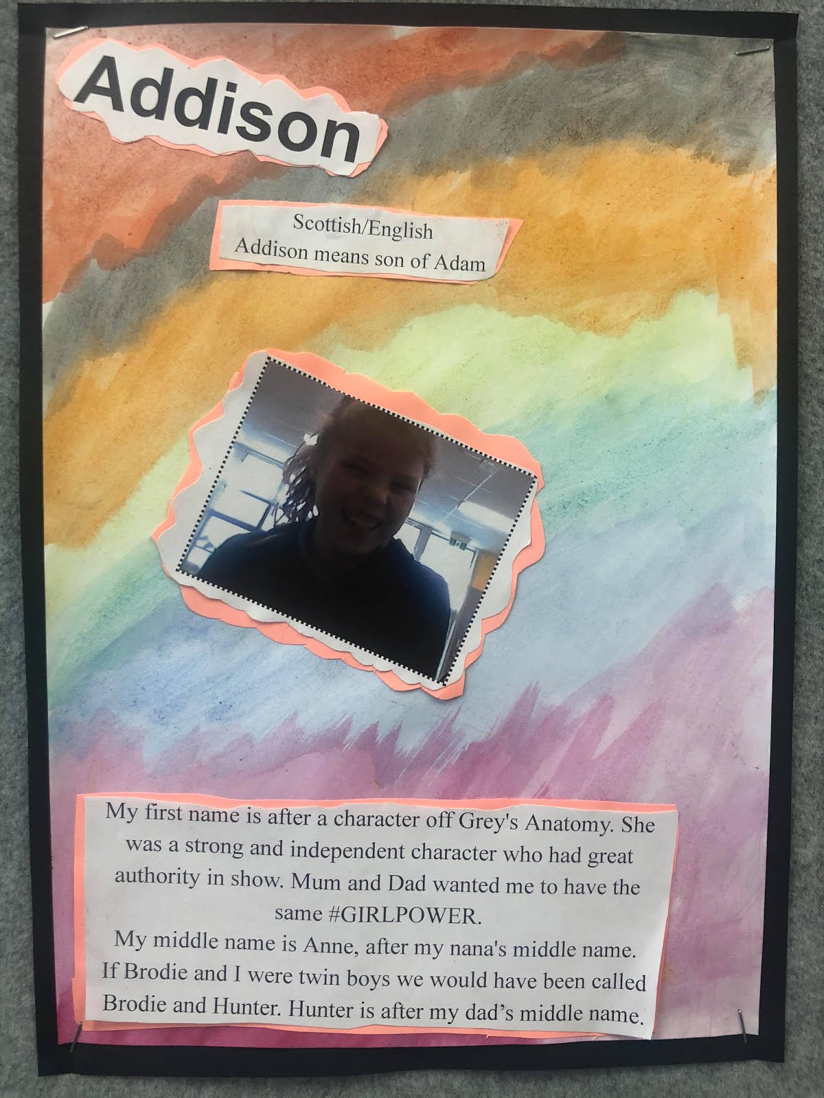 Last week for Writing we researched our own names. We wanted to find out which country they originated in, what they mean, and why our parents chose them for us. We took home some questions for our parents. They were able to tell us the story behind our names and what we would have been called if we were the opposite gender.