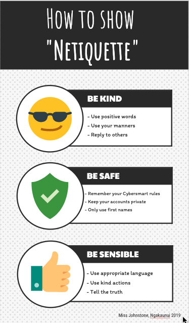 Today for Cybersmart we have been learning all about 'netiquette' and what it means. We watched some videos as a class, and made a brainstorm on the whiteboard about appropriate ways to act online. We then learned to use a new tool "Venngage" to share our learning. We had a lot of fun experimenting with this site, and created some pretty cool and informative infographics. We made sure they all had a title, at least 3 tips, and stood out in order to capture the audience's attention.